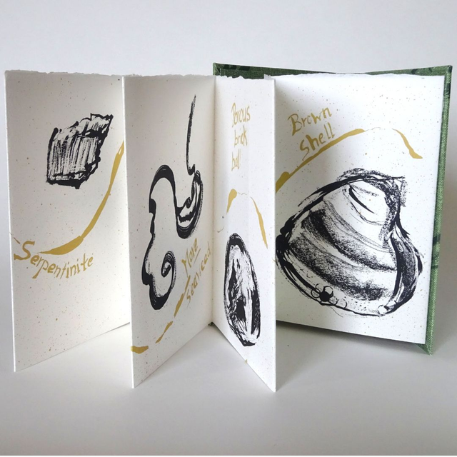 An ode to Shetland's wild places, this artist book is a treasure for beach combers everywhere. It features screenprinted drawings of items I found during a week's worth of breathtaking coastal walks in wild and windy weather, including serpendinite, shells, whispy wool and mermaid's purses. The accordion-style insert is from Somerset Satin paper and safely folds away inside hardcovers wrapped in handprinted buckram.