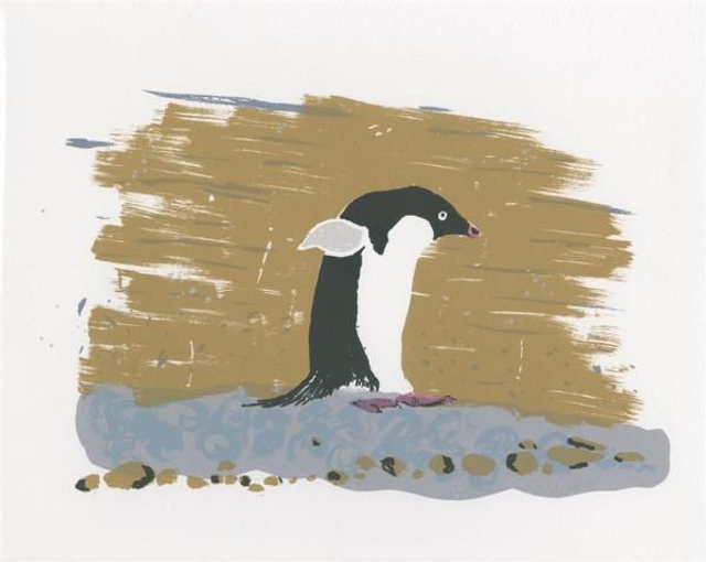 Seven layer screenprint. This charming inhabitant of Brown Bluff is determined on its way to the cold sea to go fishing. Adélies are one of only two penguin species who live on the Antarctic continent. 5 available.