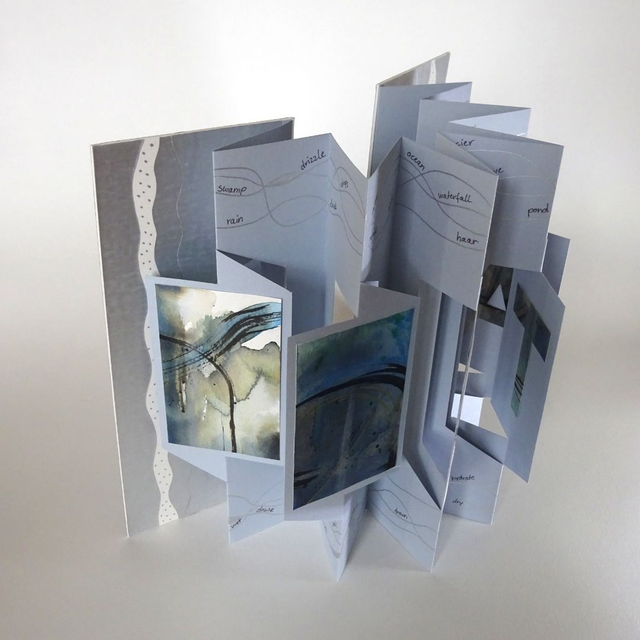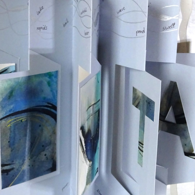 There are so many words for water in its many dimensions and I wanted to reflect just how we encounter it every day of our lives in weather or how we interact with it (or it with us!). The ink, water colour and acrylic panorama panels represent the many colours of water, showing off just a few that are not always blue. The backs of the panels feature the text “WATER!” and the silver wavy lines of marker pen are adorned by over 60 terms relating to the many ways of water.